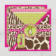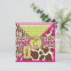 impressões Safari, girafa, zebra e chita e um padrão de bolinhas, com macacos pendurados em uma videira e etiquetas de aparência 3D, arcos, primeiro convite de aniversário.