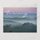 Cartão-postal de um nascer do sol nebuloso com céu e neblina cor-de-rosa entre as colinas toscanas sobre a fazenda agriturismo podere il Belvedere, no Vale de Orcia, entre Pienza e San Quirico, na Toscana, Itália, com o tekst: "Toscânia".