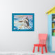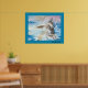 Uma pintura elegante e adorável de um cavalo branco no meio do mar ondas em tons de azul com um céu rosa. de minha coleção de animais. Esta poster tem uma estrutura azul.