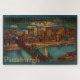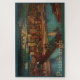 Grande quebra-cabeça com uma imagem vintage mostrando o centro Pittsburgh pela luz da lua em 1931. A vista é do rio Monongahela, uma ponte ferroviária que o percorre e os prédios de centro iluminados à noite.