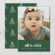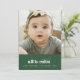 O cartão de feriado apresenta um design minimalista com uma foto de aproximação, criando um foco quente e convidativo. Abaixo da foto, um fundo verde sólido ancora o cartão, mostrando texto branco em negrito emparelhado com uma delicada letra de texto para uma estética festiva, mas calmante.