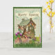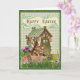 Este cartão de cartões de natal apresenta uma ilustração vintage de coelhos coelhos coelhos coelhos, ovos de férias coloridos, uma camada de grama verde e flores de tulipas. A imagem retrorativa é apresentada num fundo de linha verde. Há uma saudação dentro que você pode personalizar com suas próprias palavras.