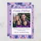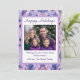 Envie alegria de férias com este cartão branco com um fundo roxo festivo e delicados ramos de pinheiro. A frente lê "Feliz feriado", e você pode personalizá-lo com sua própria foto para um toque especial e pessoal. Perfeito por acrescentar uma reviravolta única e encantadora às saudações da sua estação!