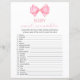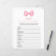 Este cartão de jogo de dois lados apresenta uma contração de palavras na frente e no bingo na parte de trás, e é perfeito para um chá de fraldas ou um borrifo de bebê. Este jogo de palavras 'scramble' apresenta um arco de coquete de aquarela rosa. Você pode personalizar este design clicando em "Personalizar este modelo" ou se quiser alterar a fonte, as cores ou organizar os elementos design de uma forma diferente, você pode clicar em "Editar usando a Ferramenta Design". Tecla de Resposta: 1. Fralda 2. Bassinet 3 Frasco 4. 5. Pacificador 6. Mudando a Mesa 7. Animal recheado 8. Rolador 9. Borracha Ducky 10. Cobertura 11. Junto 12. Fórmula 13. Alta Presidente 14. 15. Termômetro 16. Bebê 17. Leite 18. Boies 19. Um lado 20. Urso de Pelúcia