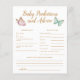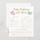 O tema da borboleta bonita prevê bebês e cartão de conselho com uma borboleta verde rosa e menta. Há flores e verde na parte de trás do cartão. Os textos são editáveis. Um jogo perfeito para jogar durante o chá e definitivamente será um excelente! O cartão aos hóspedes para predizer como o bebê se pareceria.