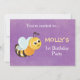 Divirta-se com este convite de festas de primeiro aniversario com o tema das abelhas! Apresentando uma abelha amarela sorridente em fundo roxo e uma alegre abelha amarela com espaço para detalhes de festas, este convite é perfeito para a celebração do primeiro aniversário de um bebê. Ideal para meninas ou meninos, este design encantador fará seus convidados sorrir.