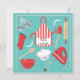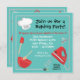Misture um pouco de diversão com um aqua e um convite vermelho. Misturador ou misturador vermelho-claro com a estrutura do cabo elétrico e utensílios vermelhos brilhantes. O chapéu de cozinheiro, avental listrado, pino rolante, luva de forno e colheres de medida completam este convite. Ilustração desenhada à mão por McBooboo