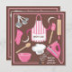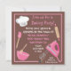 Misture um pouco de diversão com este super bonito convite cor-de-rosa e marrom. Misturador ou misturador cor-de-rosa brilhante com a estrutura do cabo elétrico e os utensílios cor-de-rosa brilhante. O chapéu de cozinheiro, avental listrado, pino rolante, luva de forno e colheres de medida completam este convite. Ilustração desenhada à mão por McBooboo