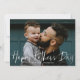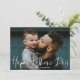 Placa de dia de os pais moderna com sua foto horizontal na frente com "Dia de os pais feliz" em um script branco, manuscrito. Personalize a frente adicionando seus nomes. A parte traseira do cartão exibe um padrão de faixa desenhado à mão com espaço para fotos e texto adicionais.