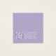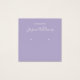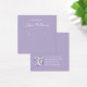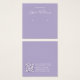 Uma simples placa de exibição de brinco de lavanda: apenas texto branco sobre fundo de lavanda (roxo claro), com os locais de brinco indicados por dois círculos muito pequenos. O nome está escrito em um roteiro elegante. Ele tem um bacalhau QR na parte de trás, na parte inferior, à esquerda da informação.