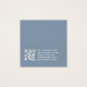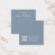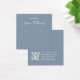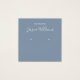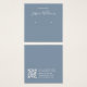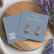 Um simples cartão de exibição de brinco azul empoeirado: apenas texto branco sobre fundo azul empoeirado (uma moderna sombra de azul), com os locais de brinco indicados por dois círculos muito pequenos. O nome está escrito em um roteiro elegante. Ele tem um código QR na parte de trás, na parte inferior, à esquerda da informação.