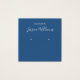 Um cartão de exibição clássico de brinco azul: apenas texto branco sobre fundo azul clássico, com os locais de brinco indicados por dois círculos muito pequenos. O nome está escrito em uma escrita moderna. Ele tem um bacalhau QR na parte de trás, na parte inferior, à esquerda da informação.