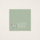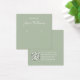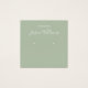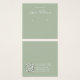 Um simples cartão de exibição de brinco: apenas um texto branco sobre fundo verde sábio (uma moderna sombra de verde), com os locais de brinco indicados por dois círculos muito pequenos. O nome está escrito em um roteiro elegante. Ele tem um código QR na parte de trás, na parte inferior, à esquerda da informação.