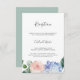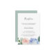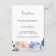 Esta elegante carta de recepção de casamento de hydrangea é perfeita para um casamento de primavera ou verão. O clássico design floral apresenta faixas de cor azul-d-água de pó macio, acentuadas com flores cor-de-rosa e folhas verdes, cor-de-rosa e borrado neutro. Personalize este cartão de recinto detalhado com as informações de recepção e inclua também o endereço do seu site de casamento!