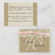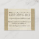 Vintage lace and burlap (local e burlap), veja as placas de inserção de informações. Para combinar convites, personalize o texto conforme necessário. Adicione os nomes da noiva e do noivo com um monograma e data de casamento às costas. Não é uma burlap real.