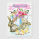 Divirta-se em enviar esta bela saudação de Páscoa de aquarela para sua família e amigos, para que eles possam aproveitá-la por muito tempo. Dois coelhos de cinza aquosa e quatro pintinhos amarelos em frente a um regador podem ser cheios de flores de primavera roxas e cor-de-rosa. Uma faixa rosa no topo com "Felz pascoa".