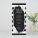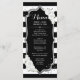Cartão de Menu. Design branco e preto clássico com prata brilhante. Possui listras brancas e pretas com rosas brancas. Perfeito para uma festa elegante.