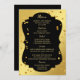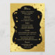 Um cartão de menu festivo e elegante com confete dourado sobre fundo preto e dourado.