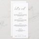 Este menu apresenta um design moderno minimalista e uma elegante fonte manuscrita. Use esta modelo para editar as fontes, a cor da fonte e a cor do plano de fundo para atender às suas necessidades de eventos. Este menu faz a adição perfeita ao seu chá de fraldas simples, minimalista, elegante ou moderno, chá de panela, casamento, aposentadoria ou qualquer outro evento! Este menu de mesa apresenta uma combinação simples de cor branca e preta, mas todas as cores são 100% editáveis para corresponder ao seu estilo.