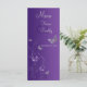 Este cartão de cardápio floral de cinzas roxas e prateadas tem borboletas roxas e prateadas e flores que correspondem ao convite de casamento mostrado abaixo. Ele foi projetado em uma placa de rack com uma frente brilhante e acabamento mate na parte traseira. Se quiser que um cartão de menu em papel de convite online corresponda aos seus convites, ou se tiver pedidos de itens adicionais ou alterações, envie um e-mail para niteowlstudio@gmail.com com a sua solicitação.