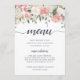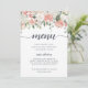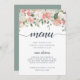 O carinhoso menu floral de verão mostra suas seleções de janto em caligrafia química e em caracteres tradicionais de blocos, acentuados por uma borda superior de flores de aquarela pastel e folhagem em tons de rosa-pincel, pêssego e verde-sábio. Projetado para combinar com nossa elegante coleção floral de MidSummer.