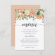 O carinhoso menu floral de verão mostra suas seleções de janto em caligrafia química e em caracteres tradicionais de blocos, acentuados por uma borda superior de flores de aquarela pastel e folhagem em tons de rosa-pincel, pêssego e verde-sábio. Projetado para combinar com nossa elegante coleção floral de MidSummer.