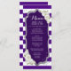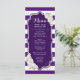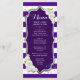 Cartão de Menu. Design de prata roxo clássico com ouro brilhante falso. Apresenta faixas e rosas brancas. Perfeito para uma festa elegante.