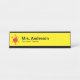 A red apple, a b c, and 1 23 are next to two lines of text. You can edit the text to show your name and job title. The desk name plate is yellow.