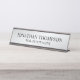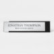 Faça sua empresa parecer mais profissional com uma placa profissional de nome preto e prateado. Esta placa de nome da mesa apresenta o nome e o título no estilo de fonte de serif profissional preto em fundo prateado. Perfeito para agente imobiliário, consultor, contabilista, gestor, professor e muitas outras profissões. Nota: Os detalhes da folha são simulados no trabalho de arte. Não será utilizada nenhuma folha de alumínio real no fazer deste produto.