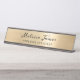 Adicione um toque de vidro ao seu escritório com esta elegante placa personalizada de nome da mesa. Este modelo de design chic apresenta um roteiro preto moderno com seu nome e profissão para personalizar sobre um fundo de textura metálica dourada escovada. Projetado apenas para você por Camisetas Extremas!