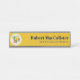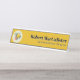 Office desk name plate with logo template. Include a name in black text with a smaller line of text for a title or position. The background is gold and the small template is on the left side.