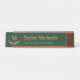 Elegant dark green nameplate with your initial above a curved greenery twig against a dark green background under your name and title in tan.