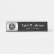 Placa de nome elegante com seu logotipo personalizado sobre um gradiente de cinza prateada com um visual de metal escovado simulado (na obra de arte). Fundo de cor preto ou personalizado com campos de modelo para o seu nome e título ou nome da empresa.