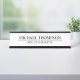 Faça sua empresa parecer mais profissional com um elegante prato preto e branco. Esta placa de nome da mesa apresenta o nome e o título no estilo de fonte de serif profissional preto com linha preta no meio sobre fundo branco. Perfeito para agente imobiliário, consultor, contabilista e muitas outras profissões.