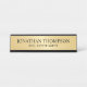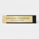 Esta placa de nome da mesa apresenta o nome e o título no estilo de fonte de serif profissional preta em fundo ouro.