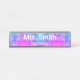 Este nome de mesa de professor de arte tem um padrão abstrato azul e roxo. O design pode lembrá-lo de gravata.