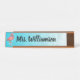 Placa de nome de mesa brilhante e colorida, com seu nome, nome do professor, nome de estilistas ou outro nome de profissionais. Perfeito para sentar na mesa de trabalho, na sala de aula, na estação de trabalho ou na área de recepção. Chic e na moda cor-de-água rosa flamingo para te levar ao espírito de praia tropical. Fundo de gradiente azul acentuado pelo seu nome de monograma.