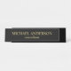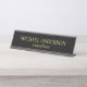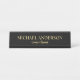 Esta placa de nome da mesa apresenta o nome no estilo de fonte de serif profissional ouro e o título no estilo de fonte de script moderno em fundo preto.
