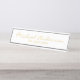 Esta placa de nome da mesa apresenta o nome no estilo de fonte dourado do script moderno e o título no estilo de fonte dourado do sans serif em fundo branco.