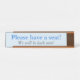Este clássico e antigo design apresenta a mensagem "Por favor, sente-se!" e a mensagem "Voltaremos em breve!". Este sistema poderia ser utilizado numa área de assentos ou numa sala de espera para informar os clientes, doentes ou visitantes de que serão assistidos em breve e de que, entretanto, deverão ter assento.