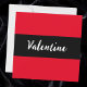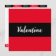 Uma placa de Dia de os namorados simples e na moda, em vermelho, preto e branco. A palavra 'Namorados' aparece na design em tipografia elegante do roteiro. O verso da placa tem bordas atraentes nas bordas superior e inferior, com o vazio restante para sua própria mensagem individual.