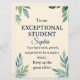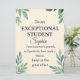 Celebrar um estudante verdadeiramente excepcional com este cartão de parabéns elegante, projetado para professores, escolas e pais orgulhosos que querem honrar a realização acadêmica de uma forma significativa. Apresentando um fundo em estilo de pergaminho suave com folhas de cor d'água e sotaques dourados, esta placa fornece uma mensagem sincera: "Para um ESTUDANTE EXCEPCIONAL - O seu trabalho de duro, crescimento e positividade causaram impacto. Continue o esforço do excelente." 🎓 Adicione o nome do seu aluno para criar uma manutenção personalizada que eles vão tesourar. Seja para graduação, prêmios de fim de ano, ou reconhecimento em sala de aula, este cartão é a maneira perfeita de dizer "Eu vejo seu esforço, e estou orgulhoso." O design é ideal para meninos e meninas adolescentes, e o campo de nomes é totalmente editável para se adequar a qualquer estudante ou ocasião.