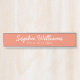 Nameplate da mesa de na moda com fontes brancas de script e título em um plano de fundo de cor rosa-rosa de salmão. Pronto para uma personalização on-line fácil.