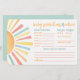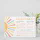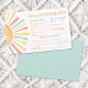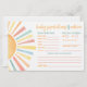 Esta placa horizontal Baby Predictions & Advice apresenta uma design colorida com tema solar com raios brilhantes em amarelo, laranja, vermelho, lacrimejo e azul para um aspecto divertido e neutro em termos de gênero. Do lado esquerdo, um sol vibrante adiciona energia alegre, enquanto o lado direito convida os hóspedes a preencherem seus palpites para a chegada do bebê — como data, hora, peso, olhos e cor de cabelo, e de quem eles se assemelharão. Na parte inferior, há espaço para os hóspedes partilharem um pouco de conselho e assinarem o seu nome, criando uma boa manutenção para os futuros pais. A parte traseira apresenta um fundo azul lacrimogêneo, mas você pode alterá-lo para qualquer cor para corresponder ao tema do chá de fraldas. Totalmente personalizável e brincalhão, este cartão é uma maneira séria de envolver todos na celebração.