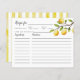 Cartão de receita cômoda para seu chá de panela tema limão com ilustração aquosa de um galho de limoeiros com as frutas de citros. Peça aos seus hóspedes para preencherem este cartão de receita e levá-los à noiva ou ao chá de casamento.