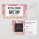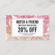 Coordena-se com o Modelo de cartão de negócios de Palmas Luminosas Tropicais Rosa/Bronze até 1201AM. Silhuetas de palmeiras criam um pano de fundo tropical nesse modelo de cartão de referência de salão moderno e sofisticado. Seu nome ou nome de empresa está estilizado em uma simples caixa preta na parte traseira para uma estética limpa e mínima que contrasta bem com o fundo falso brilhante. Atualize o texto de promoção com sua própria recompensa de referência desejada. © 1201AM CREATIVE