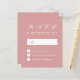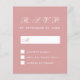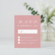 Um simples e minimalista representante de orçamento para um casamento. Tem apenas texto branco sobre fundo poeirento de rosa. O título RSVP e a letra M são escritos num guião caligráfico elegante, o resto em bonés.