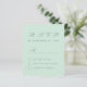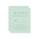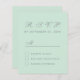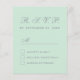 Um simples e minimalista representante de orçamento para um casamento. Tem apenas texto de cinza sobre fundo verde de menta. O título RSVP e a letra M são escritos num guião caligráfico elegante, o resto em bonés.