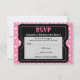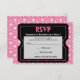 Placas de resposta RSVP para combinar os convites de tíquete, em rosa e preto com fundo rosa-quente fofo. Estimulado para se assemelhar a um ingresso com cortes falsos (não reais) e versos falsos (não reais) perfurados, este convite ousado e divertido é excelente para uma noite de raparigas divertida e entusiasmo.