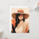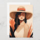 Mergulhe em tranquilidade com nosso Cartão Retrato Serene Boho, mostrando uma mulher com olhos fechados, um chapéu amplo e longos brincos. Folhas abstrato tropicais em tons quentes enquadram sua expressão pacífica, incorporando a calma boho.